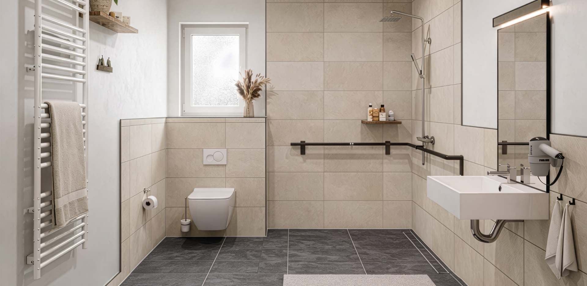 Barrierefrei & zukunftssicher – Wohnen auf einer Ebene nach DIN 18040, schwellenlos innen und außen, mit Vorrüstung für Haltegriffe und Hausnotruf.